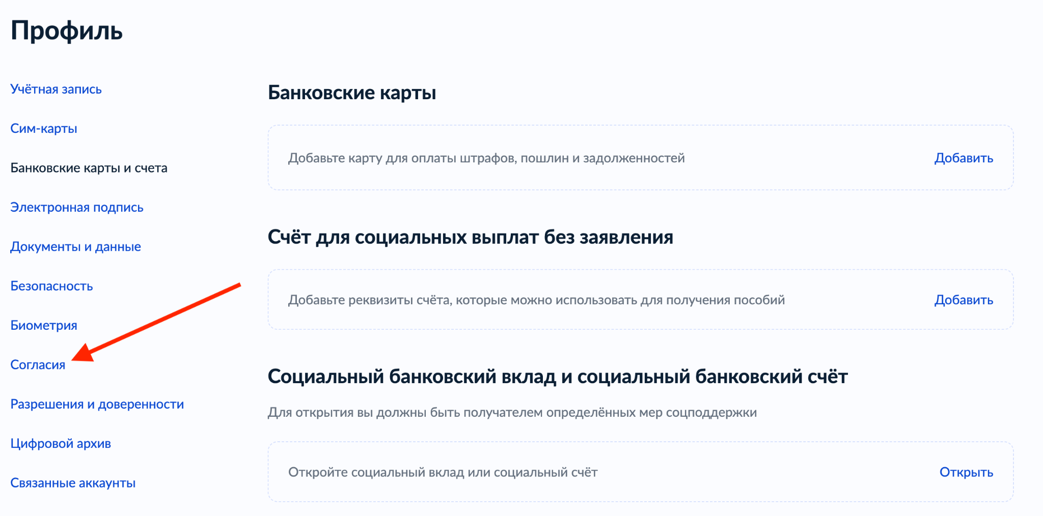 - Найдите раздел, связанный с «Биометрическими данными» или «Согласиями».